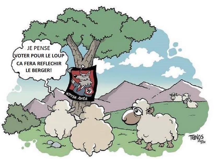It's clear that this was originally a Greek cartoon, since the Greek writing at the bottom of the campaign poster identifies the wolf with the swastika armband as a candidate for the Greek neo-fascist Golden Dawn party. Then someone translated the caption into French, possibly adapting it in the process.